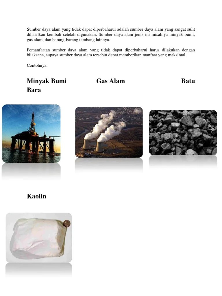 Bahan bakar fosil · 7. Sumber daya alam tidak dapat diperbarui · 1. Berdasarkan daya pakai dan nilai konsumtifnya, sumber daya alam yang tidak dapat diperbarui dibedakan . "… bahan mineral, batu bara, minyak bumi, gas alam," dicontohkan.